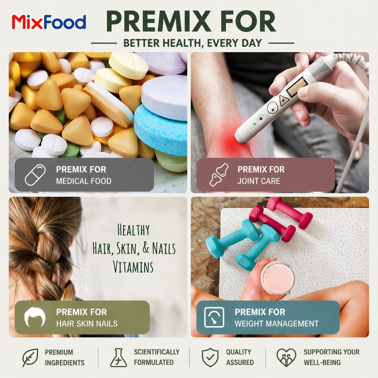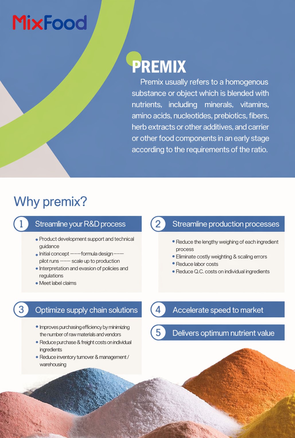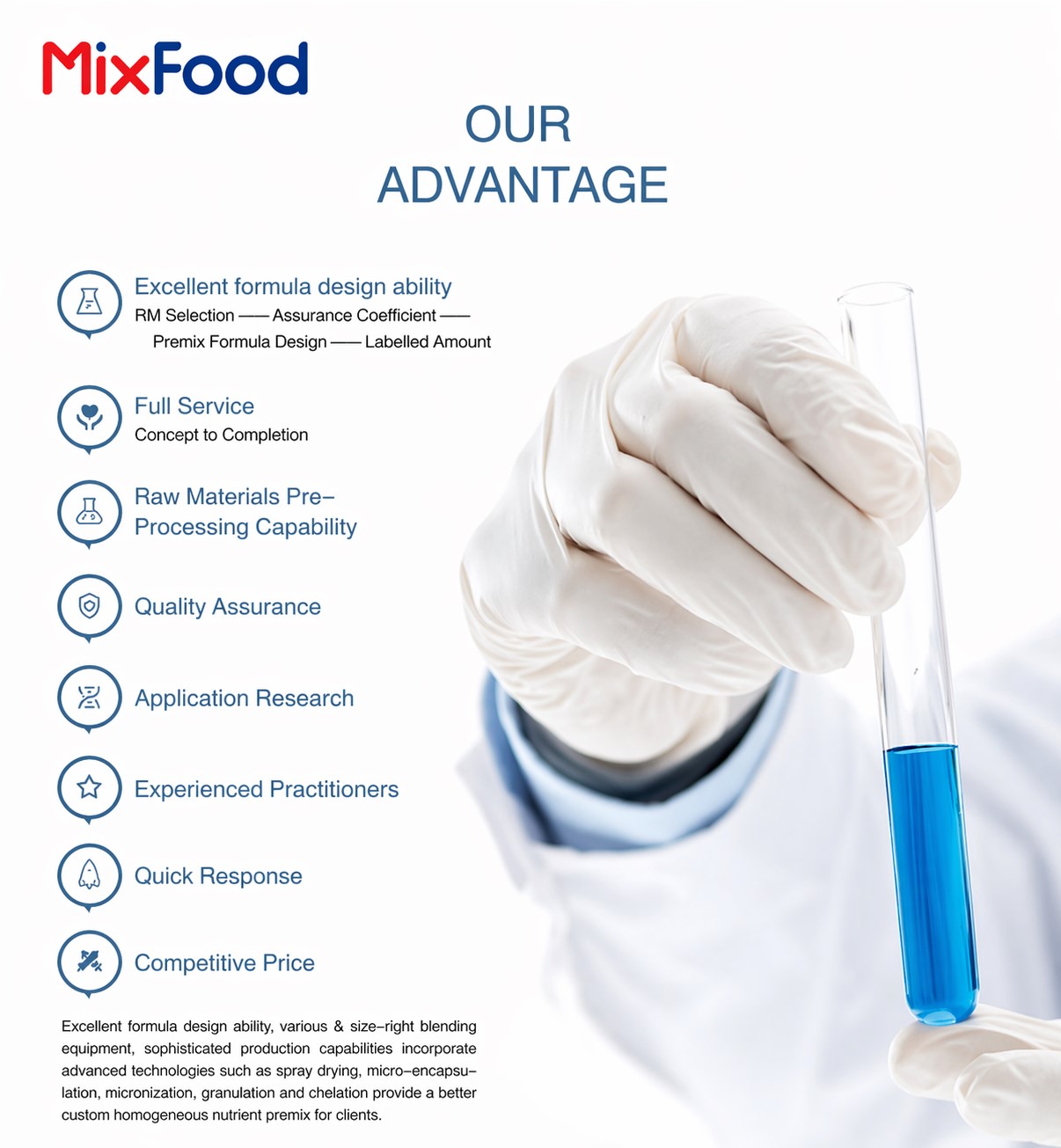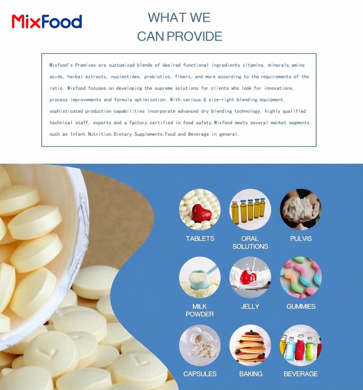 As a professional Vitamin, Mineral & Nutrient Premix supplier and manufacturer, Mixfood Biotech Corporation has been supplying and exporting Vitamin, Mineral & Nutrient Premix from China for almost 10 years, please be assured to buy Vitamin, Mineral & Nutrient Premix at Mixfood Biotech. Any inquiries and problems please feel free to send emails to us via info@mixfoodgroup.com, we will reply to you within 1 working day.